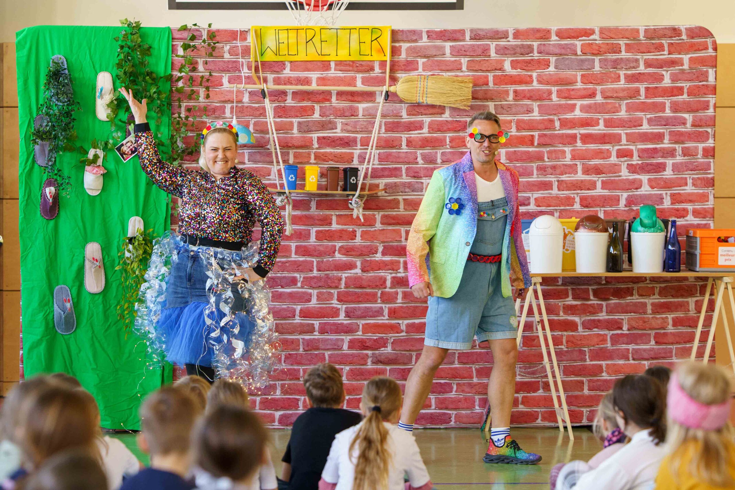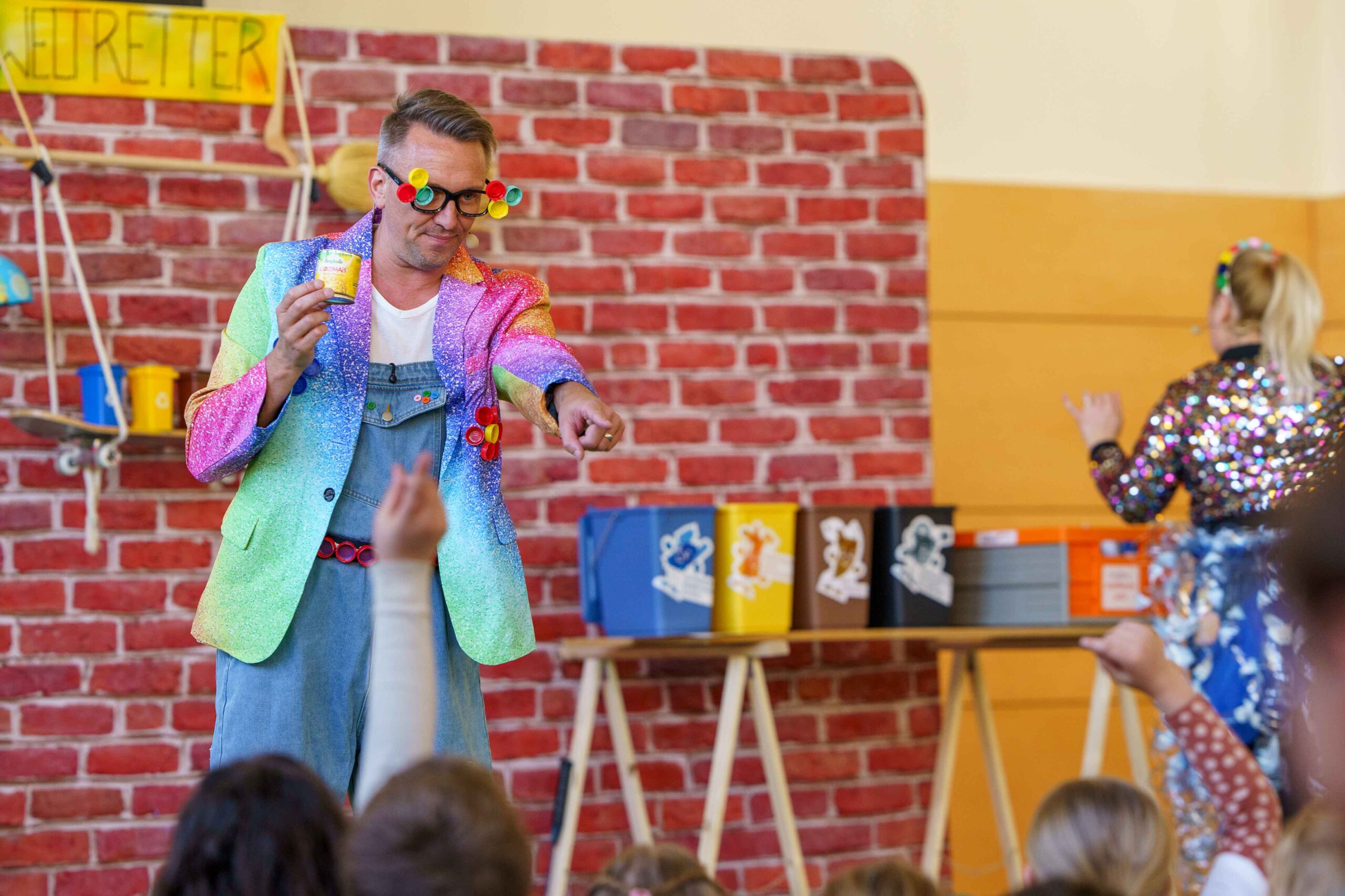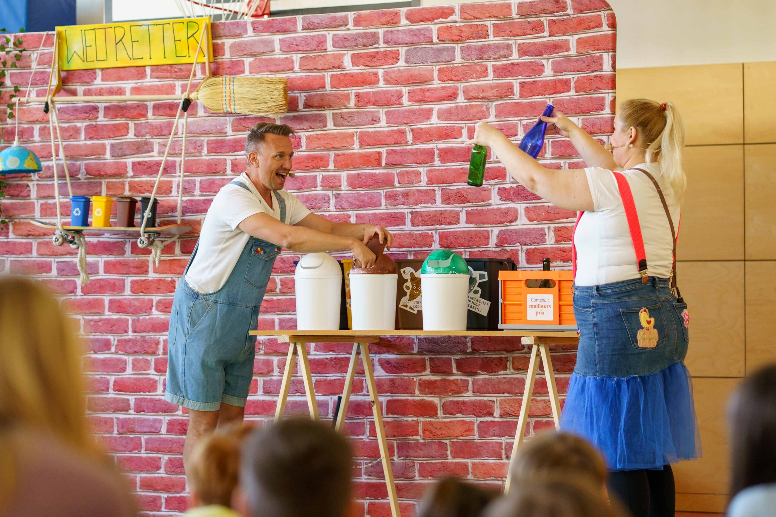 Geschrieben und auf die Bühne gebracht wird das Stück vom Autor, Schauspieler und Sänger Tom Dewulf, der seit vielen Jahren mit musikalischen Bildungsformaten arbeitet. Unterstützt wird er dabei von seiner Schauspielkollegin Carolin Hesse, die außerdem die Kostüme sowie das Bühnenbild gestaltet. Dabei steht nicht allein das richtige Entsorgen im Fokus – auch Upcycling, Second-Hand, Reparieren und Mehrweg werden altersgerecht und anschaulich behandelt.